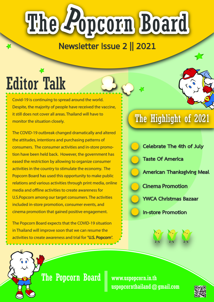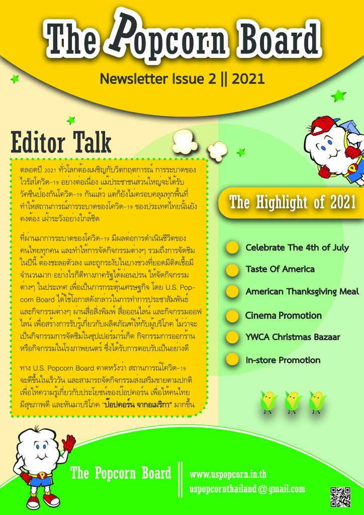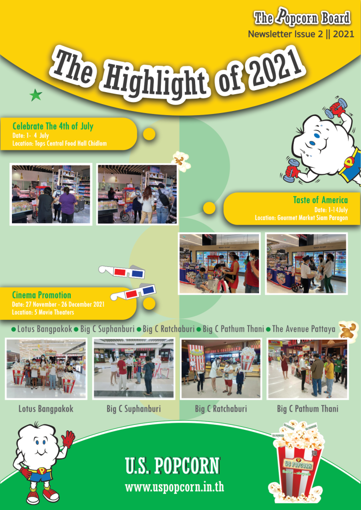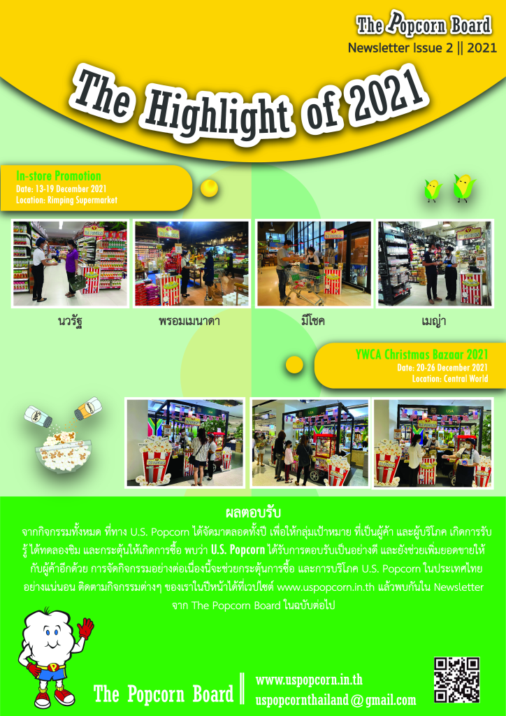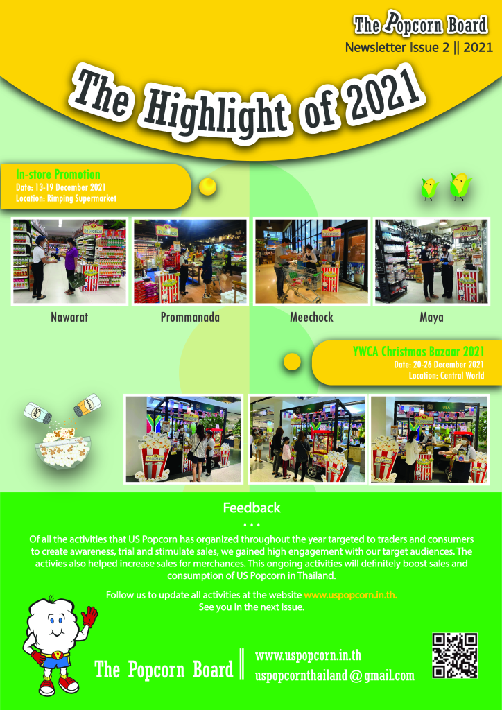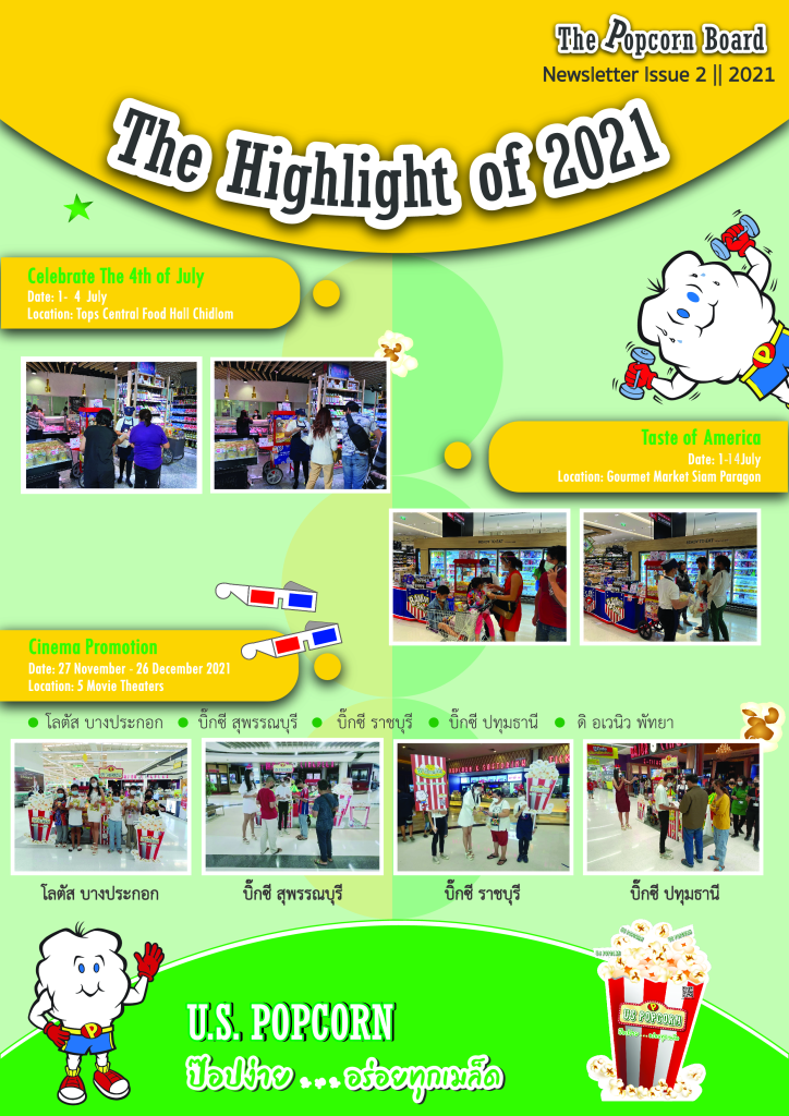 สวัสดีปีใหม่ ลูกค้าทุกท่าน ขอขอบพระคุณที่ติดตาม U.S.Popcorn Thailand มาโดยตลอด ในจดหมายข่าวฉบับนี้ จะเป็นการสรุปกิจกรรมทั้งหมด ตลอดทั้งปี 2021 หวังว่าในปีนี้ ปี 2022 จะมีกิจกรรมการส่งเสริมการบริโภคป๊อปคอร์นอเมริกา เพิ่มมากยิ่งขึ้น และหวังว่าจะได้รับการตอบรับที่ดี จากลูกค้าทุกท่าน และเพื่อนๆที่สนใจบริโภคป๊อปคอร์นยิ่งขึ้นต่อไป